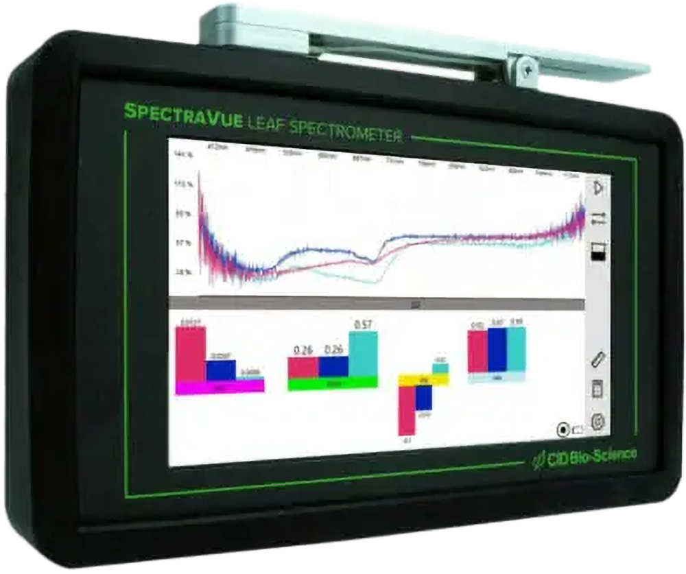 Das CI-710 Miniatur-Blatt-Spektrometer erlaubt die schnelle und zerstörungsfreie Messung von Transmission (T), Absorption (A), Reflexion (R), Intensität (I) und Bestrahlungsstärke (Ir) in einen Spektralbereich von 400-1000 nm. Das System liefert wichtige Informationen über Photosynthese, Nährstoffaufnahme, Änderungen der chemischen Zusammensetzung und Biomassekonzentration der Pflanze in Bezug auf vorherrschende Umweltparameter.